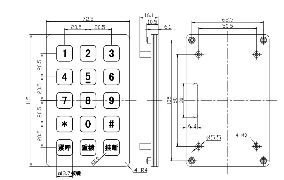 6.3X5键盘设计,10个数字键,5个功能键.按键布局都可以根据客户的要求重新设计。